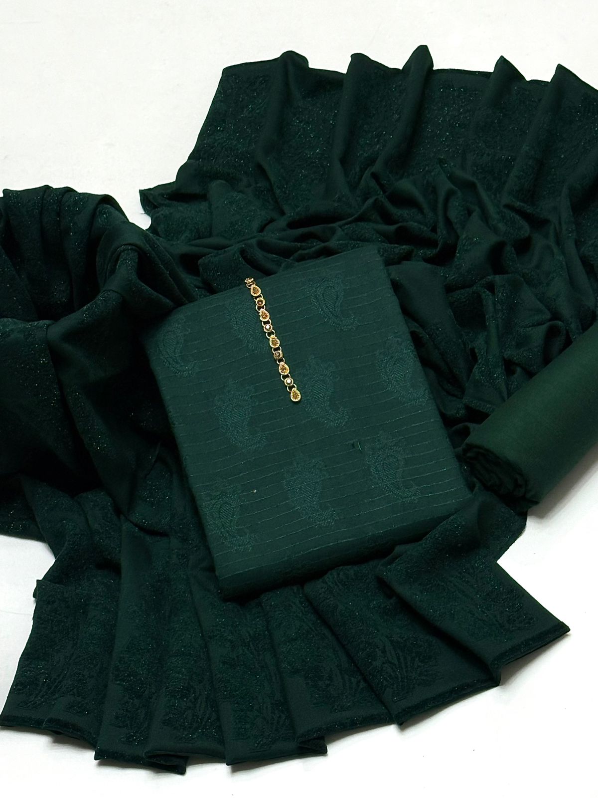 Discover timeless elegance with this premium three-piece winter ensemble. The collection showcases a meticulously crafted dhanak shirt adorned with self-jacquard patterns throughout, complemented by a richly textured jacquard palachi shawl that adds dimension and sophistication. A coordinating plain dhanak trouser rounds out the set with refined simplicity. Each piece is constructed from superior dhanak fabric, known for its durability and luxurious drape. Ideal for weddings, formal events, and special celebrations, this collection seamlessly blends traditional artistry with modern sensibilities, delivering both comfort and timeless appeal.