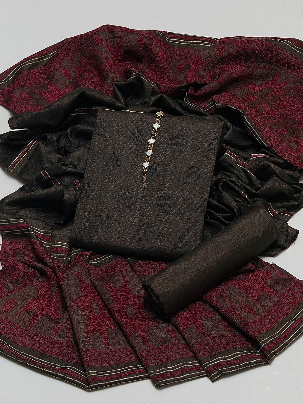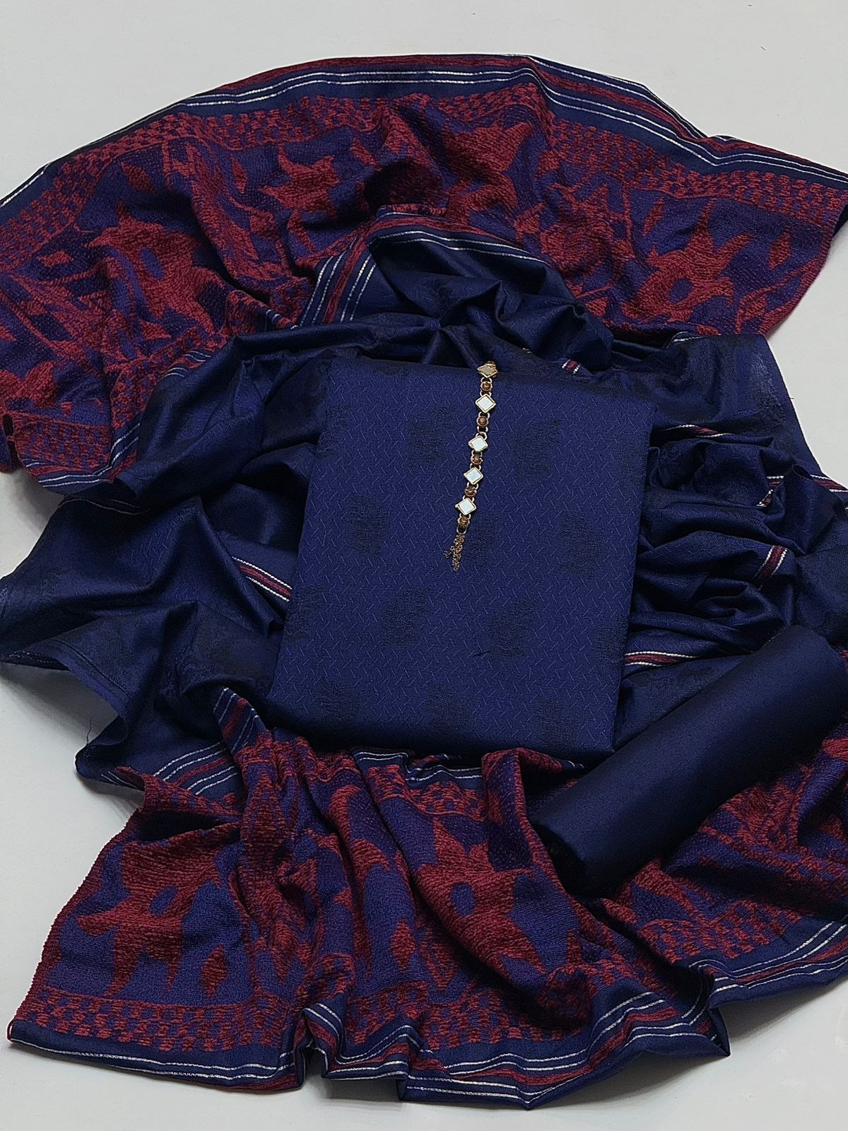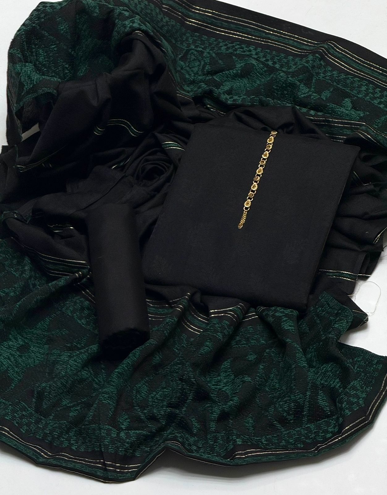 Discover timeless sophistication with this exquisite three-piece winter ensemble. The intricately crafted Multani Khaadi Khaddar Jacquard shirt features delicate self-work detailing, paired seamlessly with a tailored jacquard plain trouser for a refined silhouette. Complete the look with a sumptuous Khaadi Khaddar velvet shawl adorned with an ornate jacquard-style border. Crafted from premium fabrics, this collection celebrates traditional artistry while delivering contemporary elegance. Perfect for festive occasions and formal gatherings, this ensemble embodies the essence of Pakistani craftsmanship and luxury.