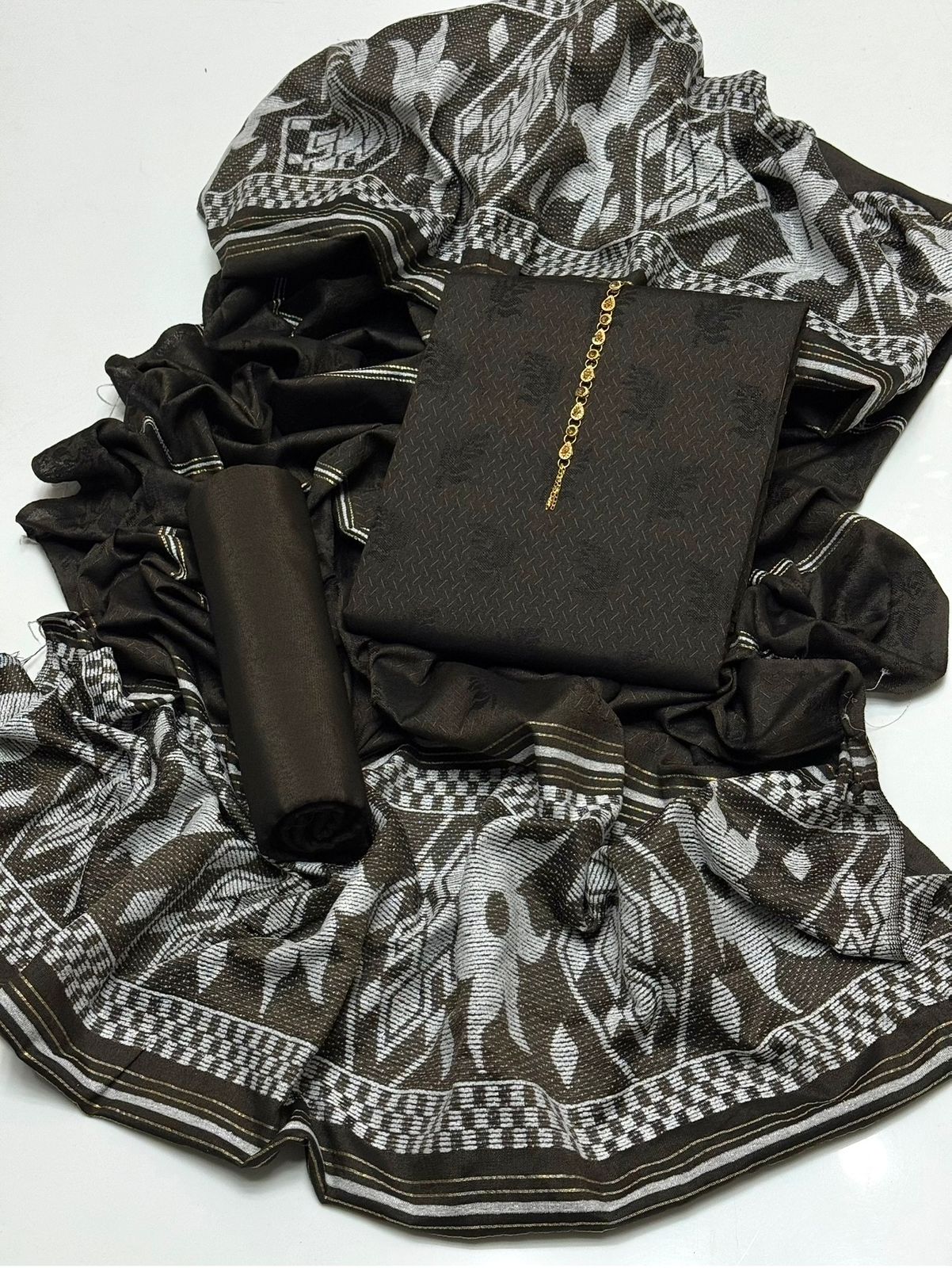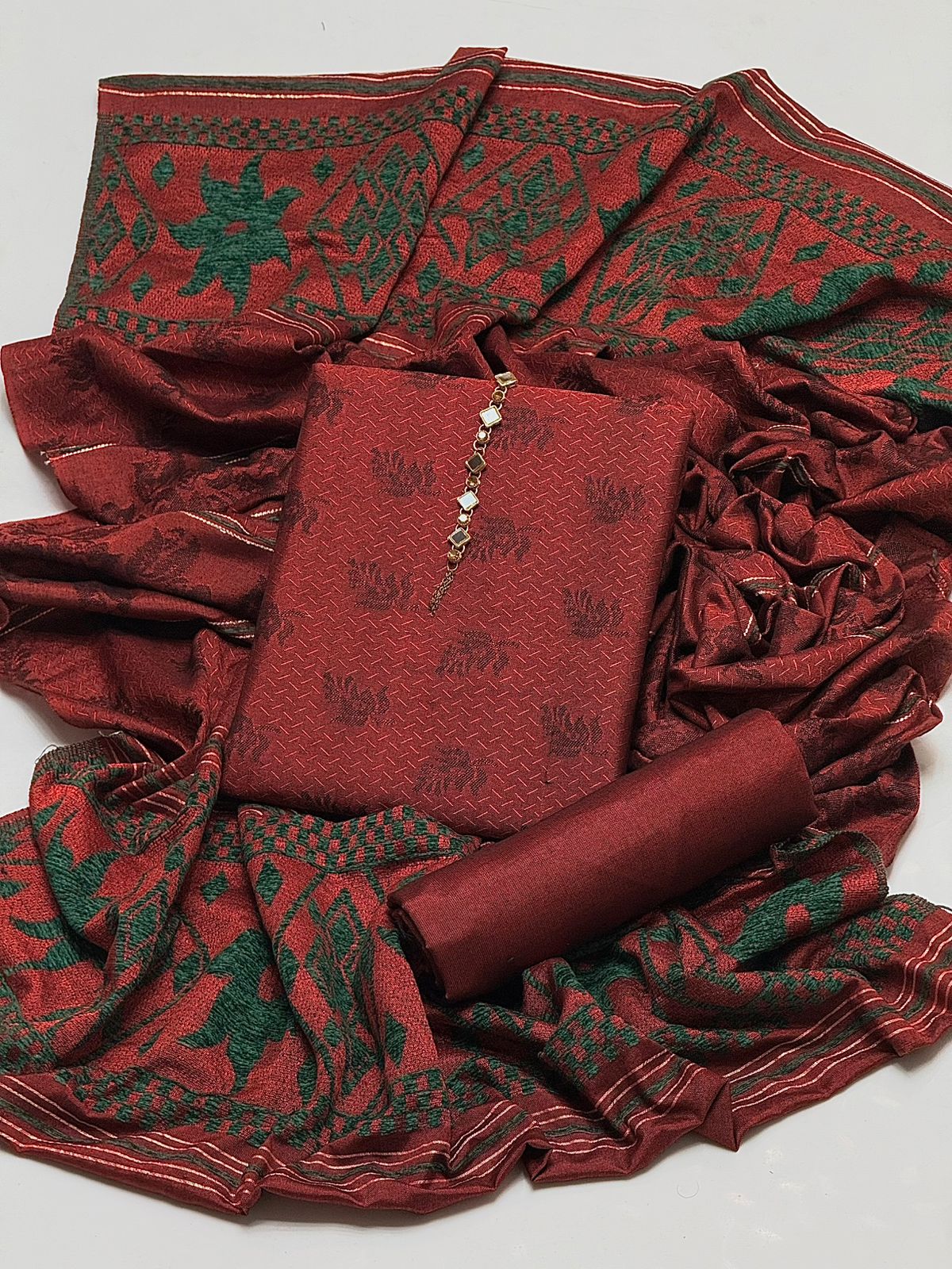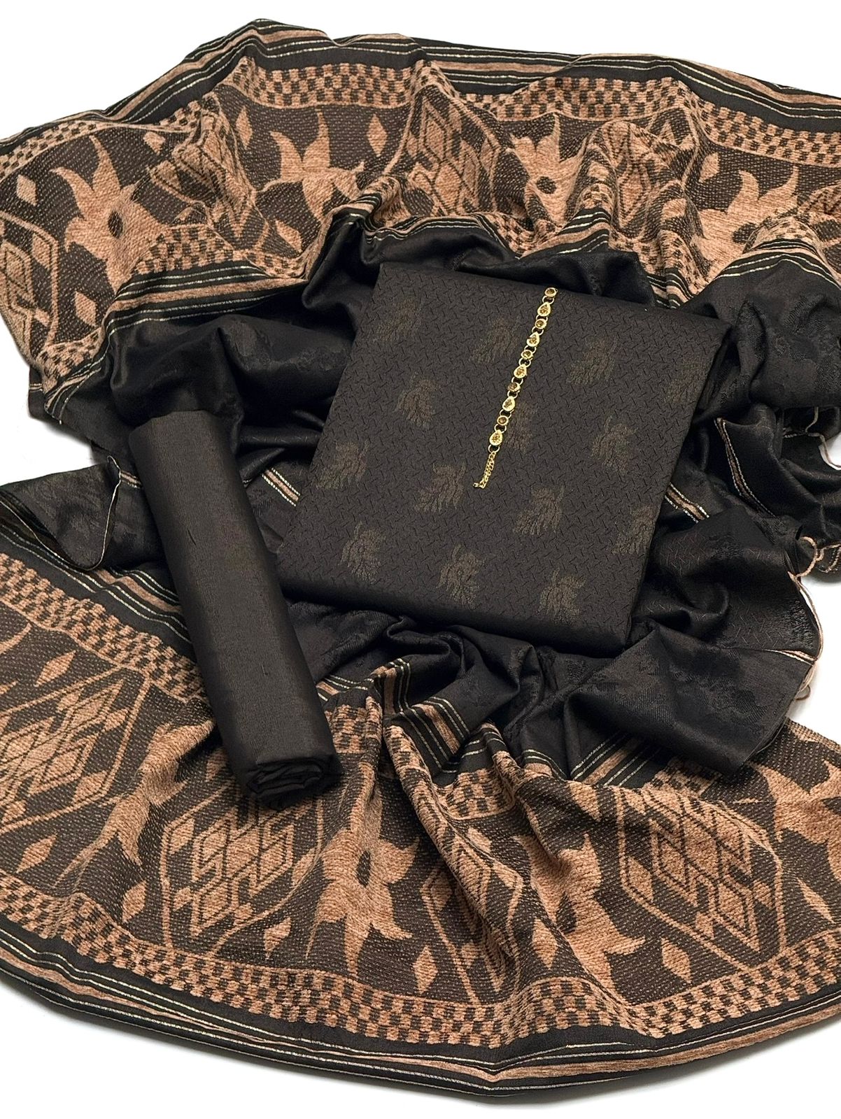 Discover timeless sophistication with this exquisite three-piece winter ensemble. The intricately crafted Multani Khaadi Khaddar Jacquard shirt features delicate self-work detailing, paired seamlessly with a tailored jacquard plain trouser for a refined silhouette. Complete the look with a sumptuous Khaadi Khaddar velvet shawl adorned with an ornate jacquard-style border. Crafted from premium fabrics, this collection celebrates traditional artistry while delivering contemporary elegance. Perfect for festive occasions and formal gatherings, this ensemble embodies the essence of Pakistani craftsmanship and luxury.